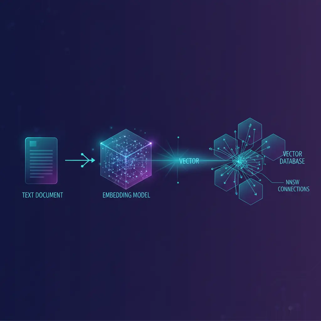 A busca exata (brute-force) em milhões de vetores é proibitivamente lenta. Vector Databases utilizam algoritmos de Approximate Nearest Neighbor (ANN), sendo o HNSW o padrão ouro atual. HNSW constrói um grafo navegável que permite encontrar os vizinhos mais próximos muito rapidamente, sacrificando uma precisão mínima (tipicamente menos de 1%) em troca de latências de milissegundos.