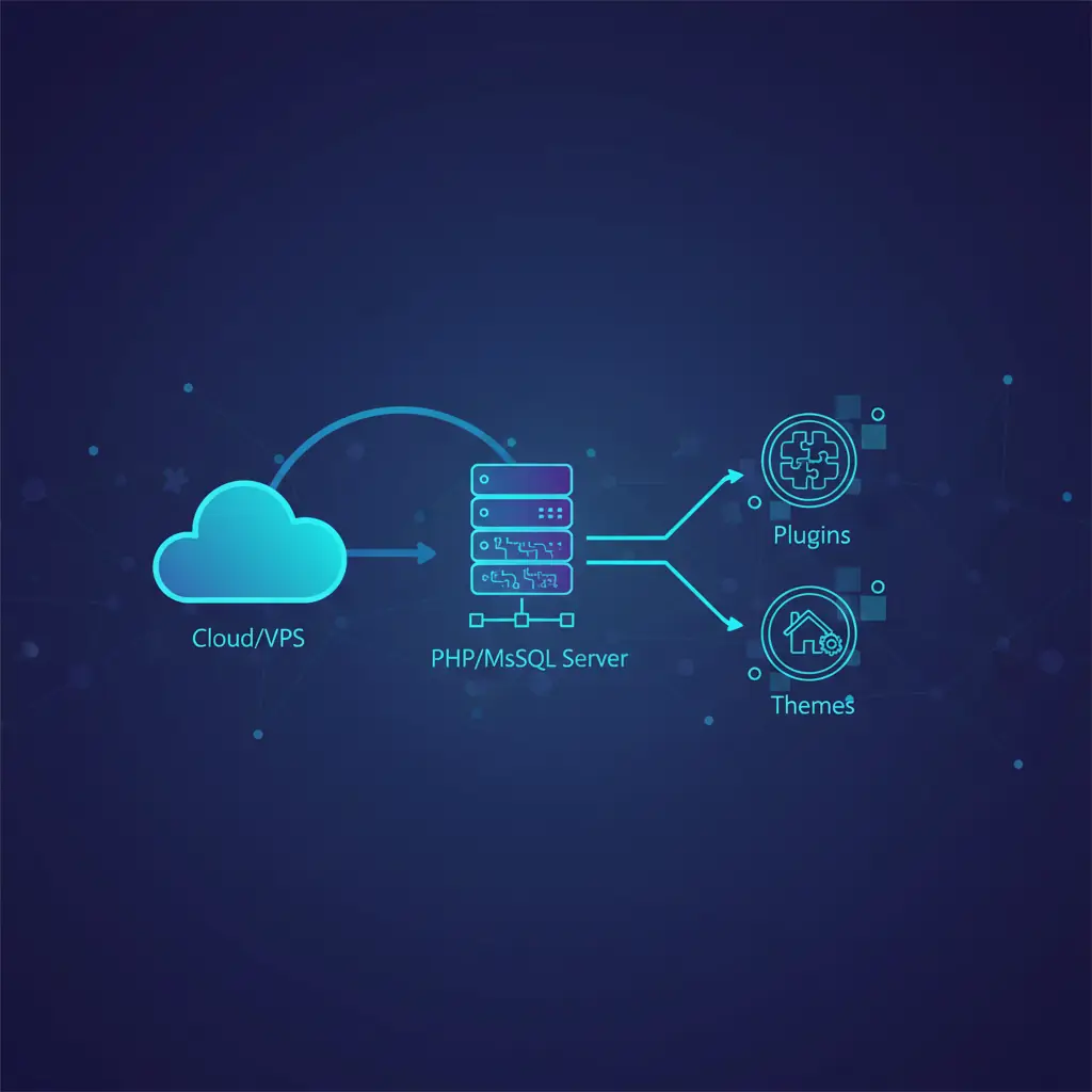 O poder do WordPress reside em sua arquitetura baseada em PHP e MySQL. Isso permite que ele seja incrivelmente adaptável. A base do sistema é o Core, que gerencia posts, páginas, usuários e mídias. Adicionamos funcionalidade através de dois pilares: